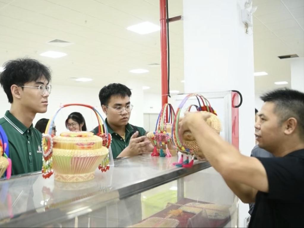 实践团队倾听非遗传承人讲解德保麦秆花篮制作技艺