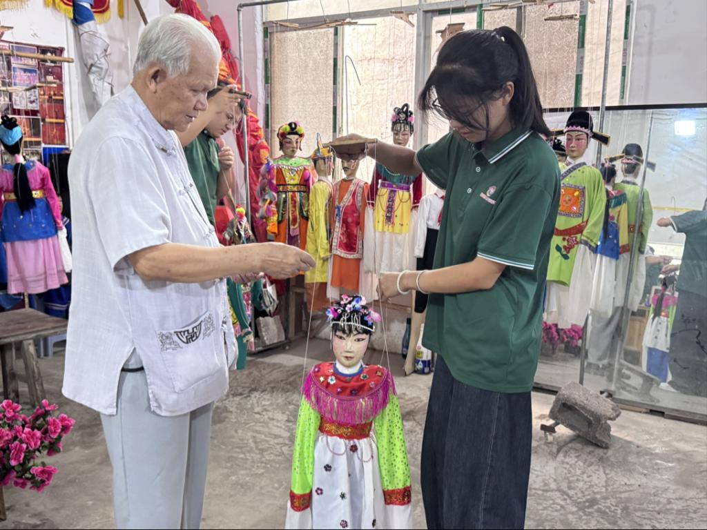 在城关镇莲城社区清水木偶壮剧团,实践团成员沉浸于提线木偶戏的非遗魅力之中。在丝线翻飞间体验千年文脉,聆听非遗传承人讲述壮剧“以偶代言”的哲学智慧,更在亲手操控时感悟“线随心动、形表神韵”的技艺精髓。成员们积极尝试创编普通话版剧本,与非遗传承人深入探讨突破地域限制、触及广泛受众的可能路径。同时,借助抖音号、视频号等新媒体平台,赋能乡村文化推广,助力提线木偶这一古老艺术在当代焕发新活力。