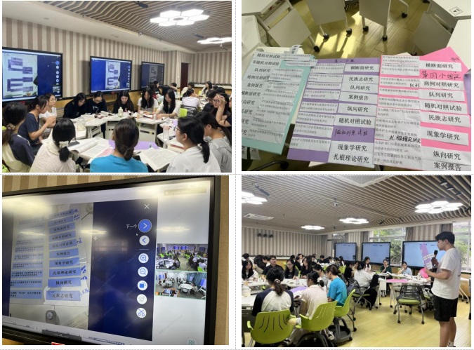 课堂活动采用“课前线上自学+课中科研设计类型分类游戏+汇报答疑”的趣味化教学流程。课前两校学生共享线上资源备课;课中由海南医科大学护理学院夏杰琼教授与必赢242net官网护理学院吕辉教授共同主导,设置两个特色游戏环节:第一轮为科研设计类型分类游戏,各小组学生按照科研设计类型分类后制成图表上传,老师通过雨课堂随机抽取了小组进行汇报,其他组补充;第二轮为科研设计应用游戏,学生为研究问题匹配合适的研究设计并制成图表上传,老师通过雨课堂随机抽取小组进行汇报,其他组分享不同观点。