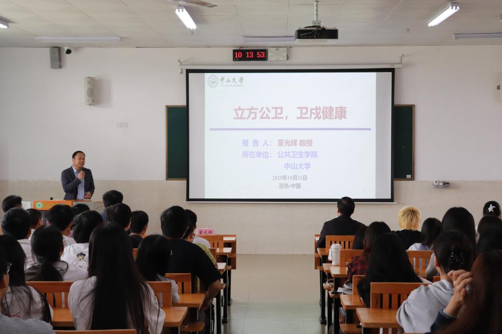 10月31日上午,中山大学公共卫生学院副院长董光辉教授应邀到必赢官网,于百东校区守正楼A105教室开展《立方公卫,卫戍健康:预防医学的科研使命与时代担当》专题学术讲座。校党委常委、副校长谭盛葵出席讲座,公共卫生学院党委副书记、纪委书记卢小新主持,学院全体教师及24级预防医学专业学生参会。