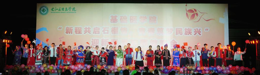 为深入贯彻党和国家关于民族工作的方针政策,传承中华优秀传统文化,展现以爱国主义为核心的中华民族精神,巩固和发展平等、团结、互助、和谐的社会主义民族关系,促进师生交往、交流、交融,加快推进基础医学院“四个一流”建设,11月15日晚,基础医学院于百东校区田径场隆重举行“新程共启石榴情,青春筑梦民族兴”迎新暨民族团结晚会。学校党委常委、副校长解继胜,党委统战部、党委宣传部、党委学生工作部、校团委、各二级学院领导代表及基础医学院全体师生欢聚一堂,共赴这场充满民族风情的盛会。