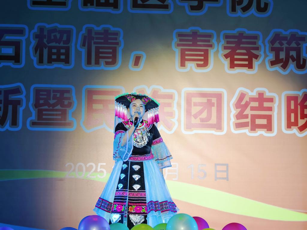 晚会以一场别开生面的民族服装秀拉开帷幕。教师们身着各民族特色服饰闪亮登场,在悠扬音乐的配合下,尽情展示各民族风采。此环节既直观展现民族文化魅力,又巧妙呼应“石榴情”主题,传递民族团结交融氛围,为晚会奠定“民族团结、青春筑梦”基调。