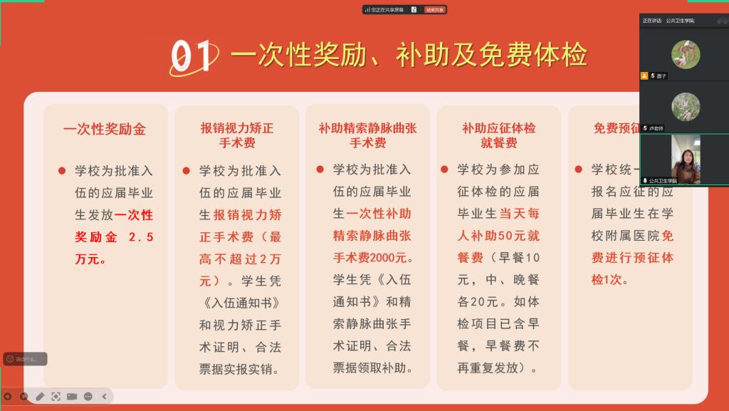 为积极响应国家征兵号召,扎实推进2026年大学生征兵工作,进一步激发广大青年学子的爱国热情与报国之志,公共卫生学院于1月12日晚通过线上召开了2026年征兵动员大会。学院党委副书记、纪委书记卢小新,辅导员、退役军人学生代表,以及2021级全体学生共同参与。