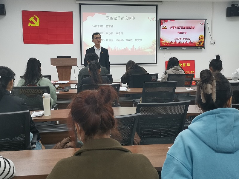 为进一步加强基层党组织建设,落实党支部发展党员工作计划,护理学院学生第四党支部于2022年12月10日晚在护理学院8-211会议室顺利召开支部党员大会,讨论接收韦艾岑等7名同志为中共预备党员相关事宜。大会由王荣贵同志主持,护理学院学生第四党支部全体党员、预备党员参会。