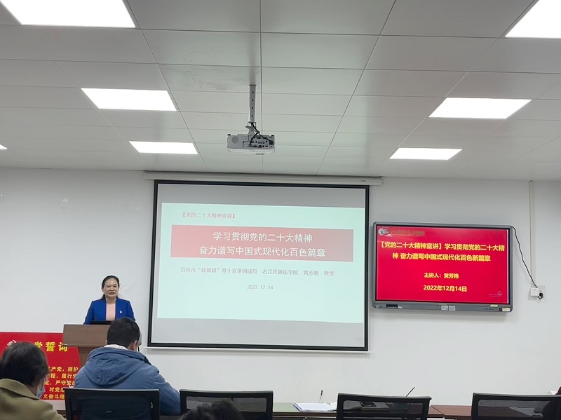 黄芳艳书记作题为《学习贯彻党的二十大精神 奋力谱写中国式现代化百色新篇章》的专题宣讲。黄书记从党的二十大大会成果开始宣讲。黄书记指出党的二十大报告是党和人民智慧的结晶,是党团结带领全国各族人民夺取中国特色社会主义新胜利的政治宣言和行动纲领,是马克思主义的纲领性文献,全体党员要全面学习把握落实党的二十大精神。